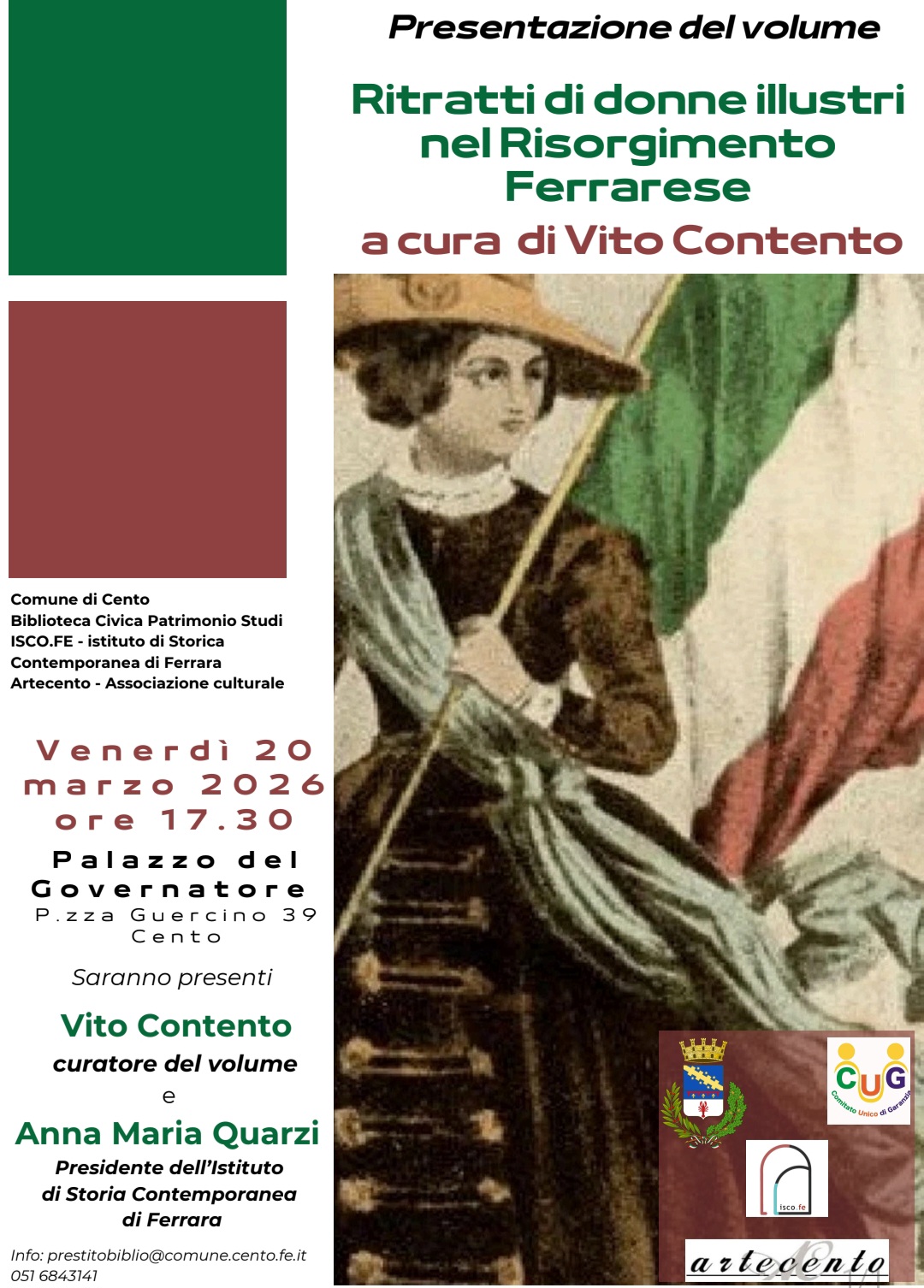 Venerdì 20 marzo alle ore 17.30 presso il Palazzo del Governatore di Cento presentazione del volume “Ritratti di donne illustri nel Risorgimento Ferrarese” a cura di Vito Contento, oltre al curatore sarà ospite la presidente dell’Istituto di Storia Contemporanea di Ferrara, la Professoressa Anna Maria Quarzi.